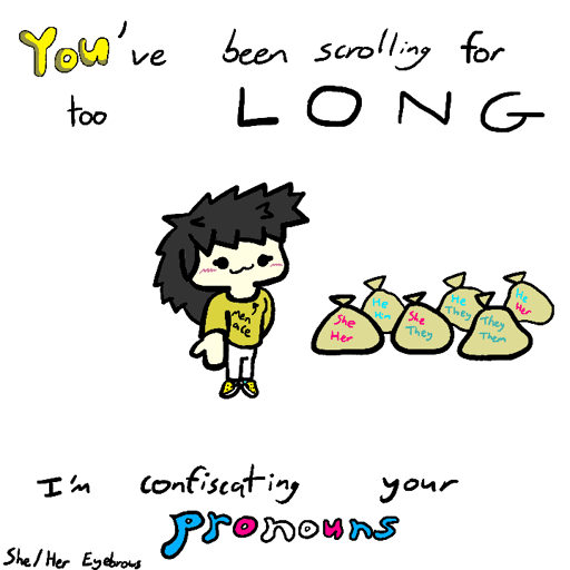 “can I have your pronouns?” NO YOU CAN’T you fey thinking you’re so sly with your word games. My girlfriend asked me “can I have your hand in marriage” and I left her immediately because I only have one of those on account of my ex wife