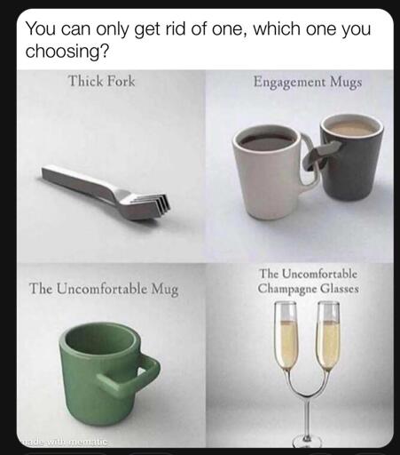 minus-squareexpatriado@lemmy.worldlinkfedilinkarrow-up0·10 months agothick fork. i don’t drink champagne, i can ignore the engagement mugs since i can serve my coffee in the still useful uncomfortable mug