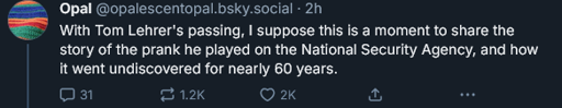 arrow-up10arrow-down1imageTIL Tom Lehrer worked for the NSAplus-squarelemmy.worldGeneral_Effort@lemmy.world to memes@lemmy.worldEnglish · 4 months agomessage-square0fedilink